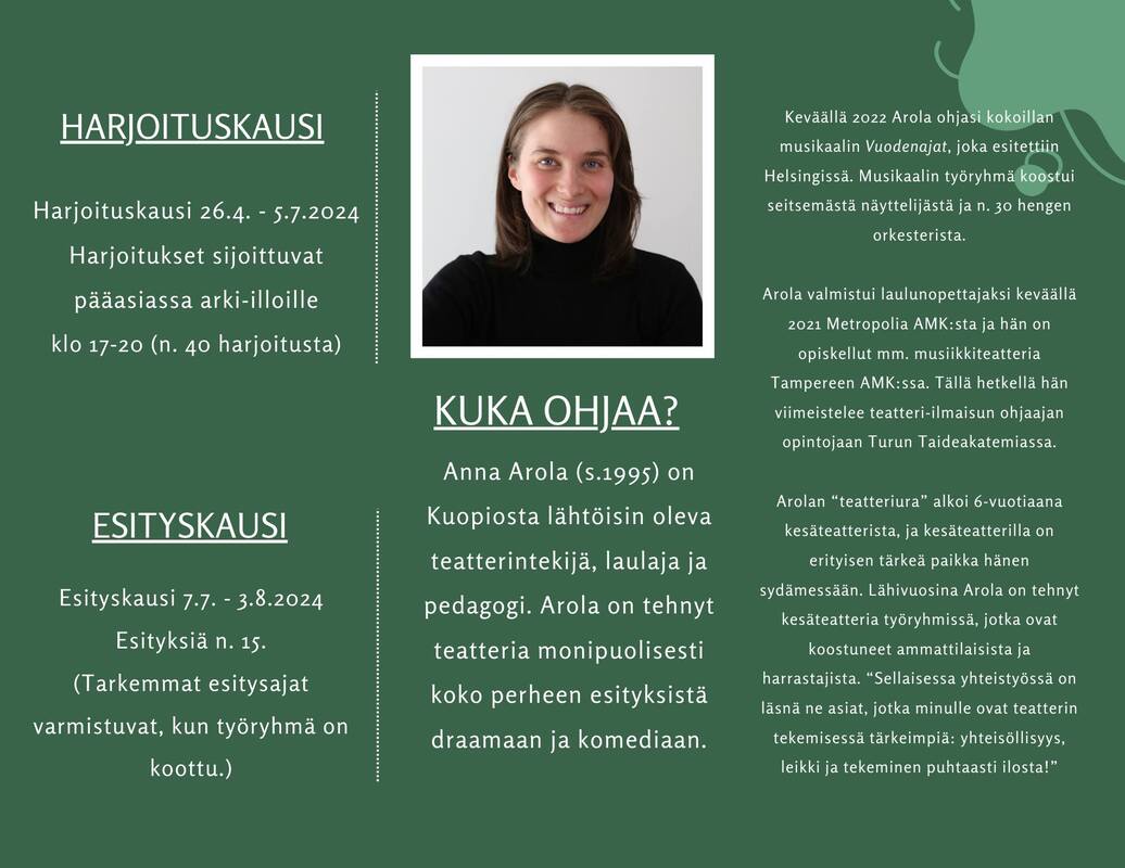 Kesäteatteriesitykseen voi hakea esiintyjäksi, soittajaksi ja toteuttajaksi. Aikaisempaa esiintymiskokemusta tai teatteritaustaa ei vaadita. Hakutilaisuus järjestetään 20.-21. Huhtikuuta klo 11-15 osoitteessa väinämöisenkatu 28, Kajaani. |