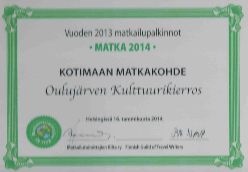 Oulujärven Kulttuurikierros on nimetty vuoden 2013 kotimaiseksi matkakohteeksi. Matkailutoimittajien Kilta ry:n valinta julkistettiin perinteisesti Matka 2014-messujen yhteydessä torstaina messujen avauspäivänä 16.1.2014 Helsingissä.