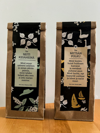 Maustettu vihreä ja musta irtotee. Pakkauksiin painettu otteet Eino Leinon runoista Juhannus ja Rauha.