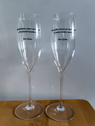 Kaksi eri juhlalasia, joihin painettu otteet Eino Leinon runosta Mua suutele kerran.