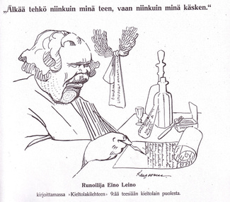 Keskustelut pöydässä jatkuivat. Eino Leino keskusteli rouva Sibeliuksen kanssa. Yhtäkkiä kesken puheen Leinon käsi taskuvarkaan käden tavoin työntyi omaan liivintaskuun. Hän otti sieltä pienen pullon, kaatoi omaan lasiinsa helmeilevää juomaa, sulki pullon ja sujautti putelin takaisin taskuunsa. Ikään kuin huomaamatta se tapahtui. Hetken kuluttua uusiutui sama temppu – huomaamatta keskustelun jatkuessa rouva Sibeliuksen kanssa. Seuraavan kerran hän täytti lasin toisesta liivintaskusta. Koko ajan hän puhui seurueen kanssa, mutta erityisesti rouvaa kohtaan hän osoitti suurta kohteliaisuutta. Kun taiteilijat luulivat Leinon pullovaraston jo loppuneen, hän veikin heidän hämmästyksekseen käden takataskuun. Sieltä ilmestyi uusi pullo, mutta seurustelu jatkui.