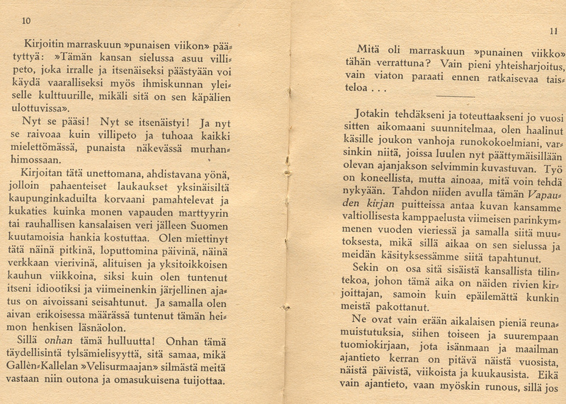 Elämän koreus Kirja ilmestyi Eino Leinon 25-vuotisen julkisen kirjailijatoiminnan merkeissä. Leinon julkinen kirjailijaura oli alkanut 26.9.1890, jolloin hänen runonsa Kajaanin linna julkaistiin Hämeen Sanomissa. Kirjan toimitusjohtaja pyysi Leinoa laatimaan kirjan alkuun pienen omaelämänkerran. Esipuheen nimeksi tuli Eräs tilinteko. Kokoelma sisälsi mm. Kukkialla kirjoitettuja runoja, jotka syntyivät Leinon oleskelusta Kukkian saaressa Hella ja Sulo Wuolijoen vieraana 1914. Kokoelma ilmestyi 23.3.1915. Kokoelmassa on Leinon valokuva, jossa hän istuu laakeriseppeleen alla Tehtaankatu 5:ssä. Kansilehti on Albert Gebhardin laatima. Toukokuun puolessavälissä kokoelma julistettiin takavarikkoon, koska painoylihallitus katsoi runojen Vapaus ja Kaiken kansan laulun (osa Väinölän väki kantaattia)sisältävän kehotusta tottelemattomuuteen lakia vastaan. Raastuvanoikeus hylkäsi kanteen Eino Leinoa vastaan, mutta päätöksestä valitettiin hovioikeuteen, ja sen päätöstä odottaessa takavarikko pidettiin voimassa. KIrja vapautettiin takavarikosta huhtikuussa 1917. |