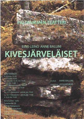 Paltaniemen teatteri esittää Paltaniemi -päivillä ja Eino Leino -talon kirjapäivillä Anne Ballinin ja Eino Leinon Kivesjärveläiset Eino Leino -talon uudella näyttämöllä pe 12.7.2013 klo 19.00 su 14.7.2013 klo 19.00 Näytelmä pohjautuu Eino Leinon (1878-1926) kirjoittamaan pienoisromaaniin Kivesjärveläiset, joka kertoo ruukin tulosta Paltamon Kivesjärvelle 1800-luvun puolenvälin tienoilla. Eino Leino kirjoitti samasta aihepiiristä runoelman ja pienoisnäytelmän. Eino Leino tutustui Kivesjärveläiset tarinoihin purjehtiessaan sukulaisiin Melalahden Antinlahteen vuosina 1890-95 ja toimiessaan taiteilija Pekka Halosen postinkantajana nuorena ylioppilaana kesällä 1895 Kivesjärven Virpelään, jossa Halonen maalasi kesällä. |